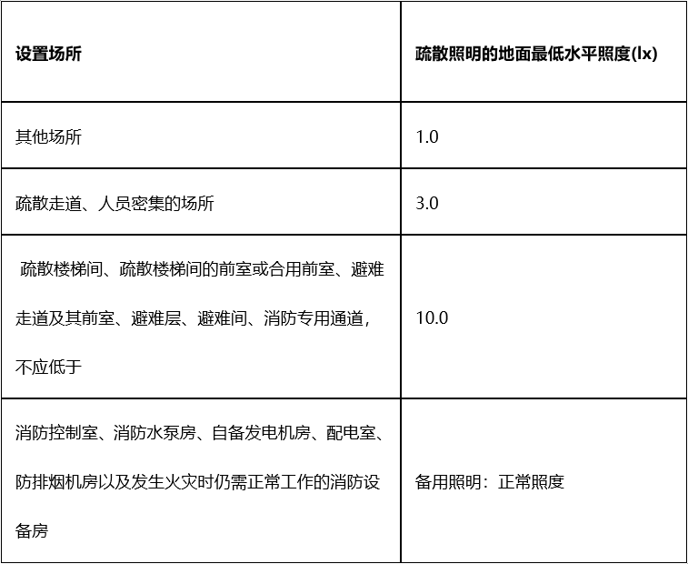 1. 应选择采用节能光源的灯具,消防应急照明灯具(以下简称“照明灯”)的光源色温不应低于2700K。 2. 不应采用蓄光型指示标志替代消防应急标志灯具(以下简称“标志灯”)。 3. 灯具的蓄电池电源宜优先选择安全性高、不含重金属等对环境有害物质的蓄电池。 4. 设置在距地面8m及以下的灯具的电压等级及供电方式应符合下列规定: 1)应选择A型灯具; 2)地面上设置的标志灯应选择集中电源A型灯具; 3)未设置消防控制室的住宅建筑,疏散走道、楼梯间等场所可选择自带电源B型灯具。 5. 灯具面板或灯罩的材质应符合下列规定: 1)除地面上设置的标志灯的面板可以采用厚度4mm及以上的钢化玻璃外,设置在距地面1m及以下的标志灯的面板或灯罩不应采用易碎材料或玻璃材质; 2)在顶棚、疏散路径上方设置的灯具的面板或灯罩不应采用玻璃材质。 6. 标志灯的规格应符合下列规定: 1)室内高度大于4.5m的场所,应选择特大型或大型标志灯; 2)室内高度为3.5m~4.5m的场所,应选择大型或中型标志灯; 3)室内高度小于3.5m的场所,应选择中型或小型标志灯。 7. 灯具及其连接附件的防护等级应符合下列规定: 1)在室外或地面上设置时,防护等级不应低于IP67; 2)在隧道场所、潮湿场所内设置时,防护等级不应低于IP65; 3)B型灯具的防护等级不应低于IP34。 8. 标志灯应选择持续型灯具。 9. 交通隧道和地铁隧道宜选择带有米标的方向标志灯。 应急转换时间 1. 高危险场所灯具光源应急点亮的响应时间不应大于0.25s; 2. 其他场所灯具光源应急点亮的响应时间不应大于5s; 3. 具有两种及以上疏散指示方案的场所,标志灯光源点亮、熄灭的响应时间不应大于5s。 备用电源的连续供电时间: 地面水平最低照度: